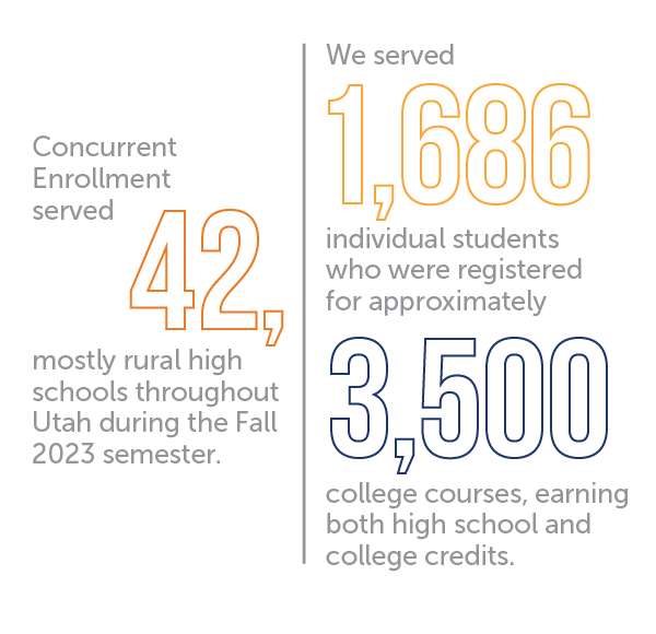 Concurrent Enrollment served 42, mostly rural high schools throughout Utah during the Fall 2023 semester. We served 1,686 individual students who were registered for approximately 3,500 college courses, earning both high school and college credits.